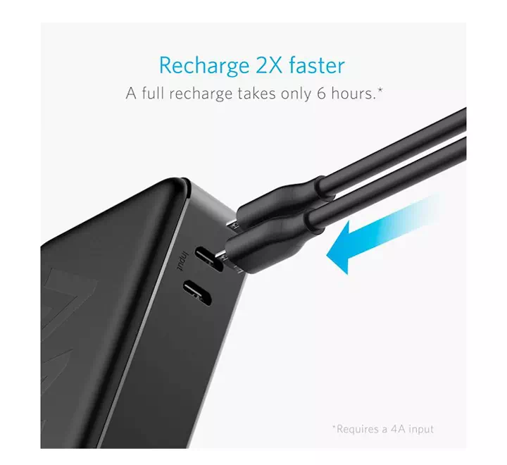 | ორმაგი სიჩქარით დატენვა: ორმაგი შეყვანის პორტებისა და მაქსიმალური შეყვანის 4A გამოყენებით, სრულ დამუხტვას სჭირდება სულ რაღაც 6 საათზე ნაკლები | |